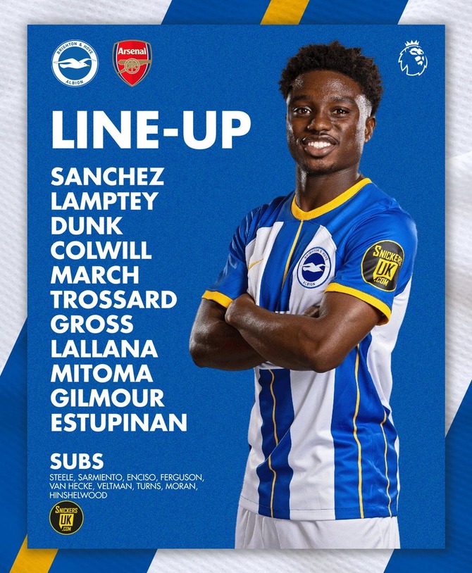 【速報】ブライトン三笘薫さん、アーセナル戦スタメンキターー!!www…なお冨安さんベンチスタート