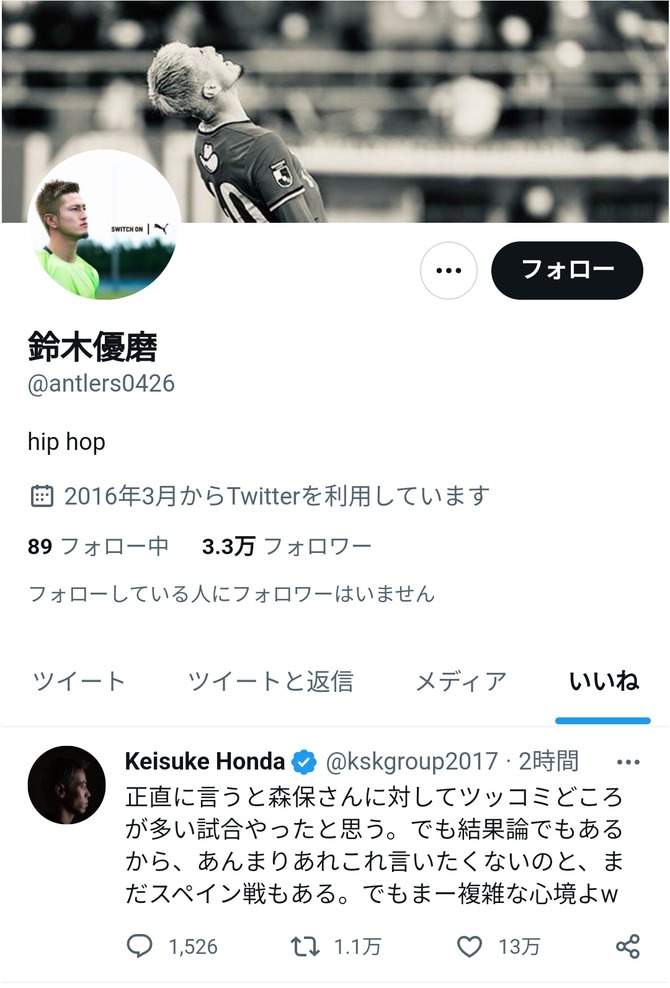 【悲報】鈴木優磨さん、またしても森保批判ツイートに「いいね」してしまうwwwww