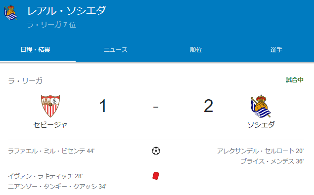 【速報】久保前半10分から出場のソシエダvsセビージャ(退場2人)の前半終了wwwwwwwww