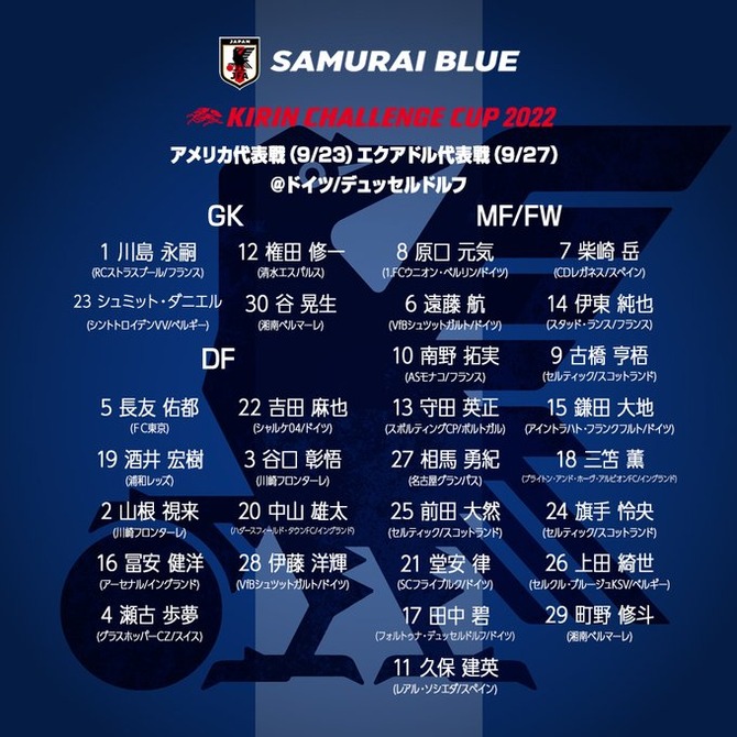 【速報】サッカー日本代表、アメリカ&エクアドル戦のメンバー発表キターー!!wwwwwww