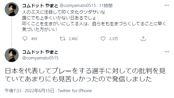 【悲報】コムドットのやまと、吉田麻也への批判を批判wwwww