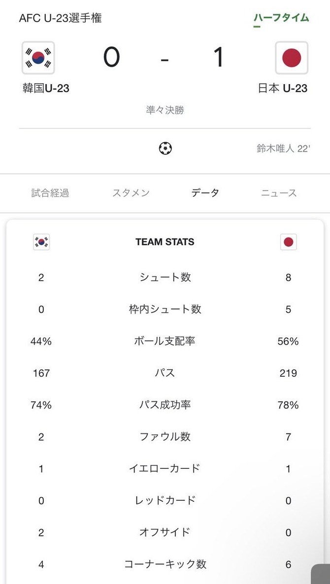 【速報】サッカーU21日本代表、U23韓国相手に1点リードで前半終了wwwwwww