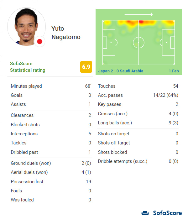 【悲報】長友佑都さん、サウジ戦のスタッツが酷すぎる件wwwwwwww