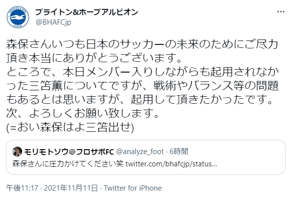 【緊急】三笘薫のブライトン公式ツイッター…森保に暴言を吐き大炎上中wwww