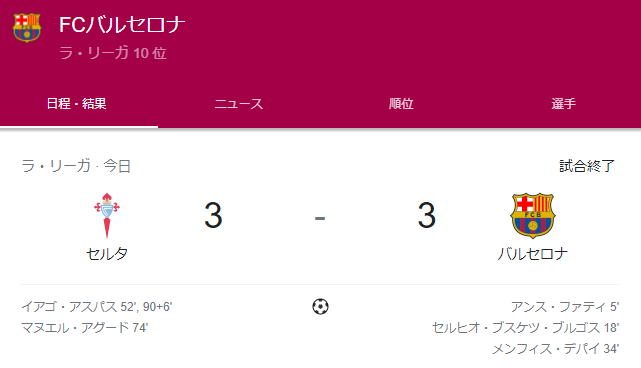 【速報】バルセロナさん、3-0から試合終了際に追いつかれて逝くwwwwwwwww
