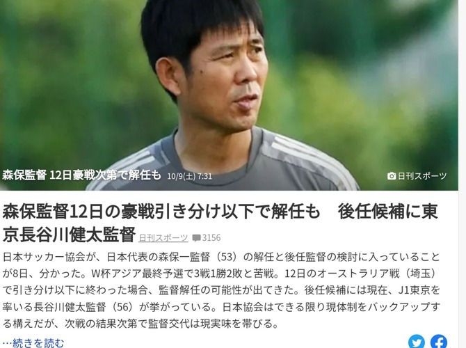 【速報】サッカー森保監督、次戦敗戦でクビへ…新監督には長谷川健太wwwwww