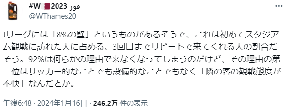【悲報】Jリーグさん、新規がリピーターになる割合が8%だった模様…