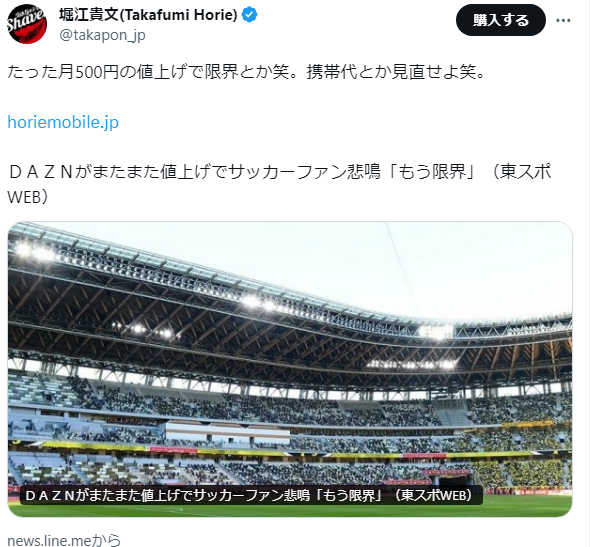【悲報】堀江貴文(ホリエモン)「たった月500円の値上げで限界とか笑」サッカーファンのDAZN値上げへの悲鳴報道に私見「携帯代とか見直せよ笑」