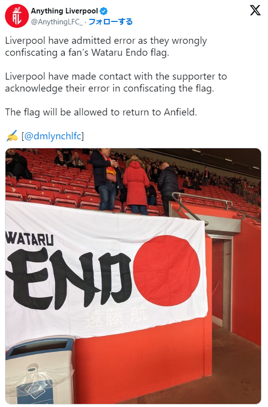 【悲報】リバプールさん、日本人の日の丸バナーを誤って政治的だと没収して謝罪し返還www