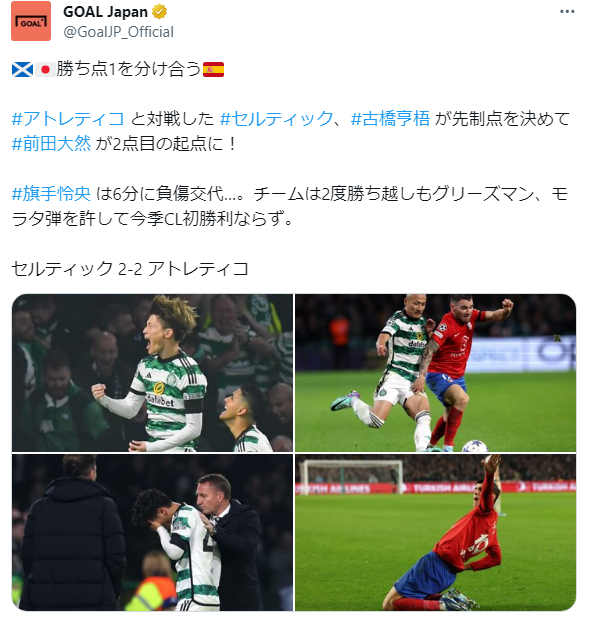 【速報】セルティック古橋1ゴール&前田1アシストの活躍でアトレティコ相手に勝ち点ゲットwww