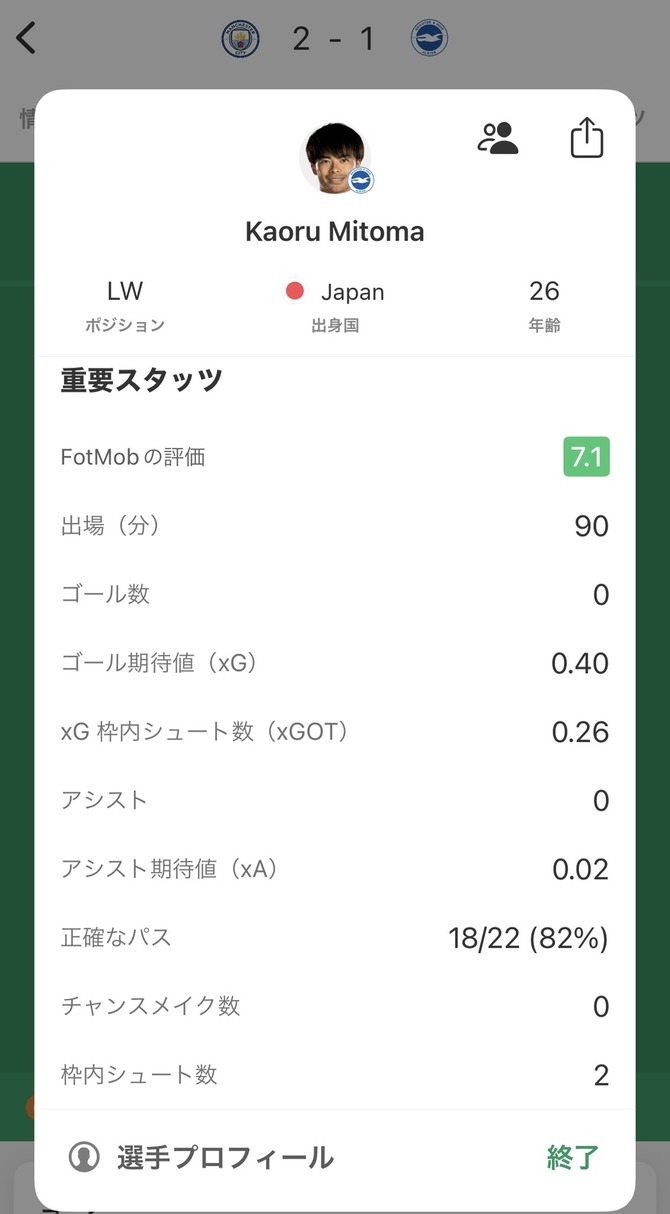 【速報】ブライトン三笘薫さん、シティ戦のスタッツwwwwwwwww
