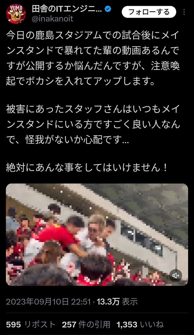 【動画】Jリーグサポさん、スタジアム内でスタッフを階段から突き落としてしまう…