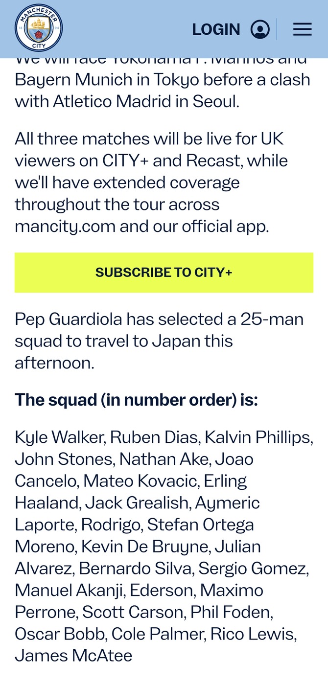 【速報】マンチェスターシティ、ついに日本ツアーの選手25人を発表!その中に鎌田の名前は…