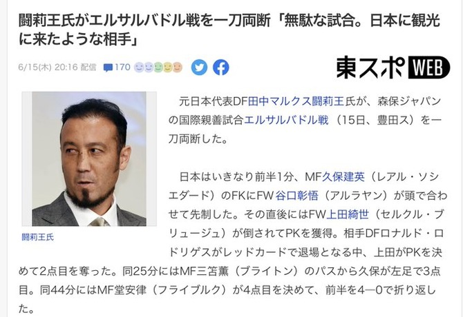【悲報】闘莉王さん…エルサルバドル戦を一刀両断「無駄な試合。日本に観光に来たような相手」