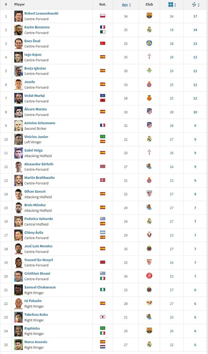 【悲報】現在のラリーガ得点ランキングwwwwwwwwww