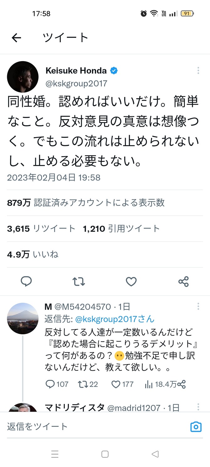 【悲報】本田圭佑さん「同性婚なんて認めればいいだけ。反対意見の真意なんて想像つくわ」