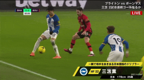 【GIF】三笘薫さん、ボンマス戦のヒールターンが上手いと話題にwwwwww