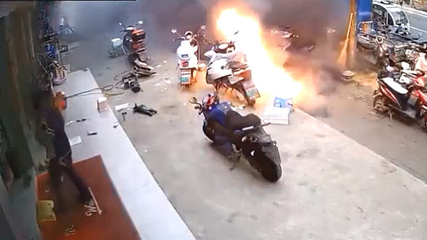 【動画】中国、また電動バイクのバッテリーが爆発!突然、黒煙を吐き出し火を噴く…