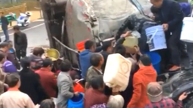 【動画】中国、タンク車が横転し食用油が流出!噂を嗅ぎつけた住民殺到し略奪開始!