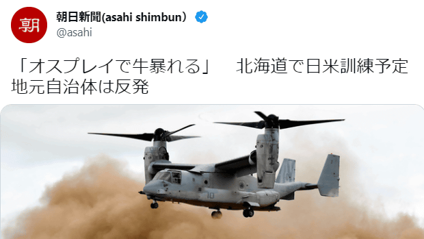 朝日新聞の見出しがおかしい!「オスプレイで牛暴れる」⇒ 牛は、まだ暴れていない!