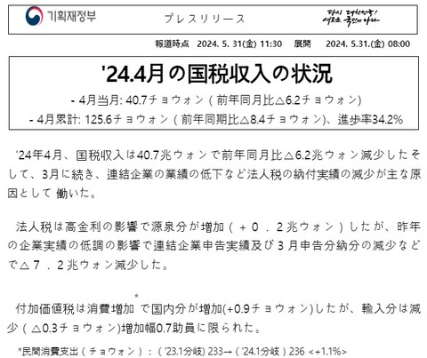 【不況】韓国の財政さらに傾く。国税収入04月6.2兆ショート! 法人税収入が64%減少!