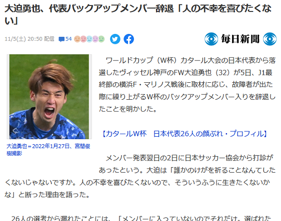 【悲報】大迫、中山負傷でメンバー入りのチャンスが巡ってくるも、バックアップメンバーを拒否してたせいで町野が代役に選出