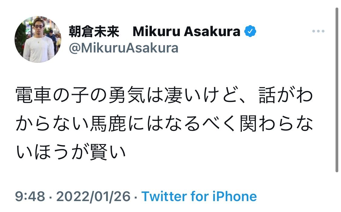 【電車タバコ事件】朝倉未来「高校生の勇気は素晴らしいが、馬鹿には関わらないほうが良い」