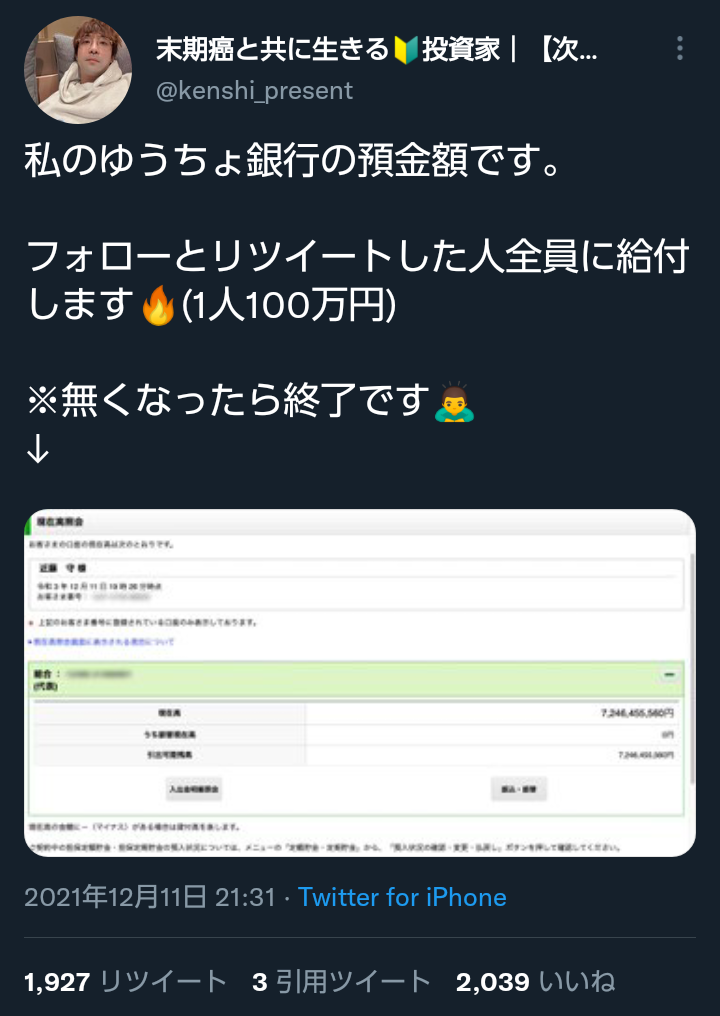 【底辺で遊ぶな】大富豪の末期癌患者さん「リツイートした人に100万円あげる」→結果wwwwwwwwwwwww