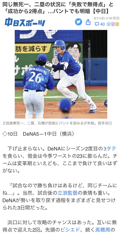 【大本営も…】中日スポーツ、立浪監督批判を始める「全てチグハグ。借金23。変革期とはこんなに負けていいわけない」【ドラゴンズは負けてない?】