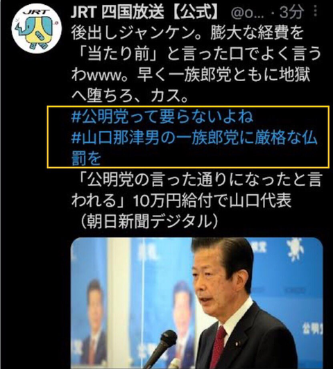【悲報】四国放送、公式ツイッターで公明党を誹謗中傷 「地獄へ堕ちろ、カス」などと呟く→謝罪へ【愛国無罪?】
