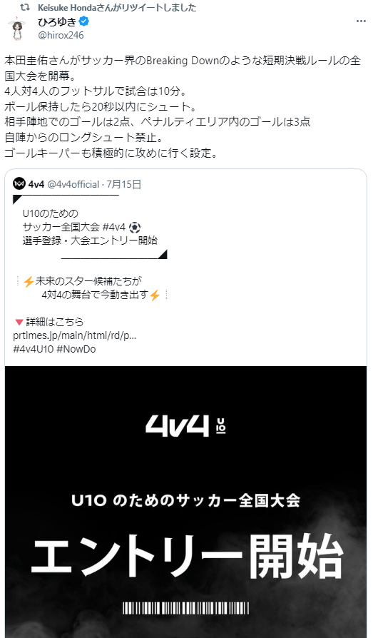 【朗報】本田圭佑さん、新たな大会を開催!ひろゆき「サッカー界のBreakingDown」ネット「ブルーロック」と沸くwwwwwww